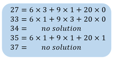 那很快我們就會發現其實有些組合數是湊不出來的,例如7、8、10、11等等,如果到了麥當勞跟店員點這些數量的雞塊可能馬上會被翻白眼。但是如果數字大了點,可憐的店員可能就要想一下了,如果是27呢? 好像可以...33呢? 好像可以? 那34呢好像就不行了...