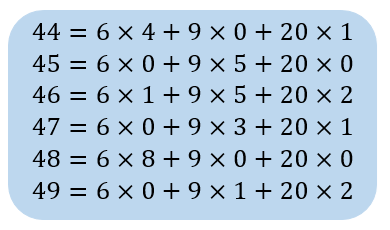 那簡單的證明就像這樣,只要44$\mathrm{\sim}$49都能被組合出來,往後的數字都可以用一個6來做循環,也因此更大的數字一定都可以被6,9,20湊出來了。換句話說,我們可以確認43為6,9,20所無法組成的最大整數。