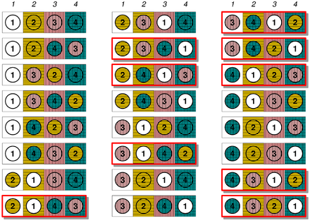 那要計算滿足這個條件(完全沒有信封放到正確的信封裡)最簡單的方式就是窮舉法,對於$\mathrm{n=4}$的況下我們總共有$\mathrm{N=}\mathrm{4!}\mathrm{=}\mathrm{24}$種組合數,所以以窮舉列表的方式我們可以快速得到以下的結果