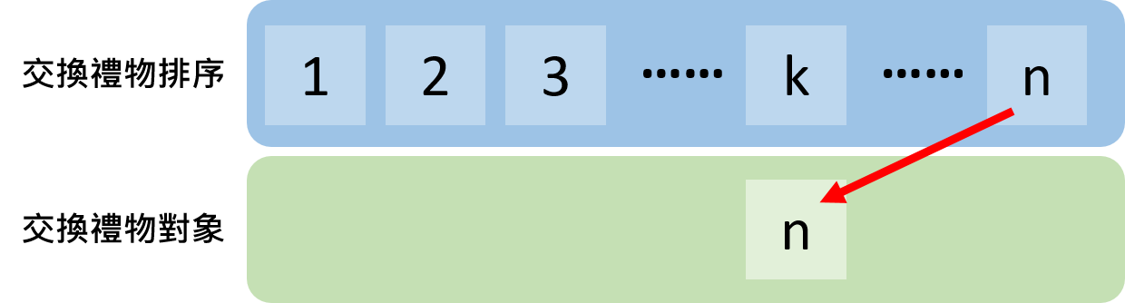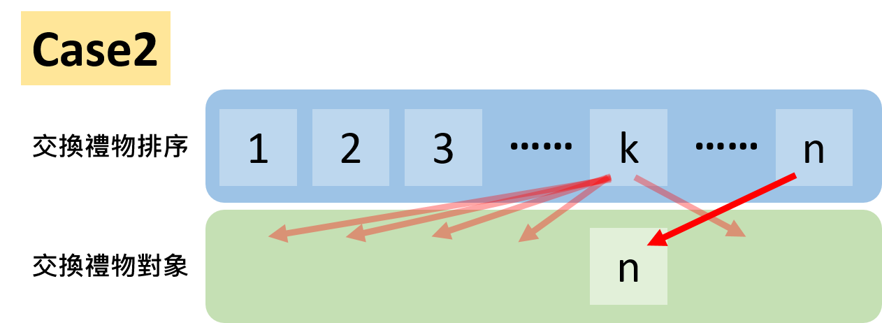 對於Case2,就是在第$k$位收到第$n$位的禮物後,他不能回送給第$n$位的狀態,那對於k來講,他可以選擇送1也好,2也好...送k-1位也好...送n-1也可以,就是不能送給第$n$位。