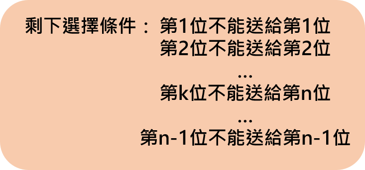 那在這樣的條件下,我們就回到類似這樣的錯排條件,對於所有人初始的條件就是不能送給自己,只有第$k$位的條件不能送給第$n$位,那其實這樣的結果就是有$\left(n-1\right)$個人要錯排的情形了也就是說有$D_{n-1}$種選擇數了!